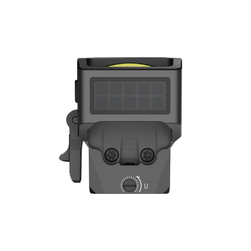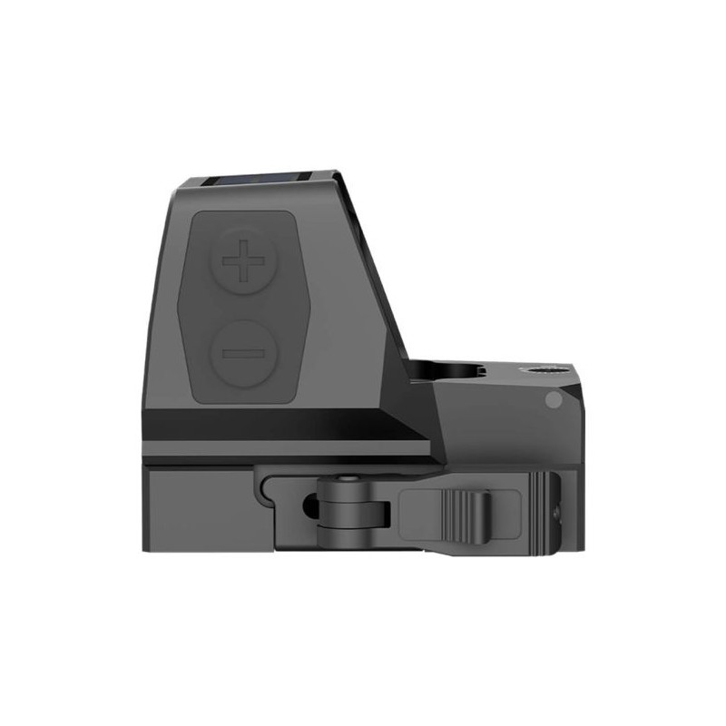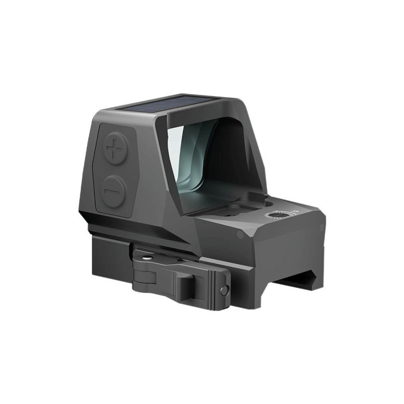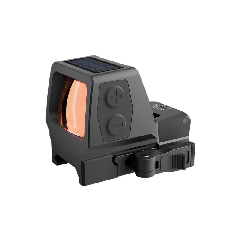 Ce point rouge est équipé d’un panneau solaire sur le dessus, qui alimente le réticule en extérieur. Il utilise également une pile CR2032 lorsqu’il est utilisé en intérieur ; celle-ci est remplaçable par le côté du boîtier, sans avoir à démonter l’optique — et donc sans devoir refaire le zéro. La pile offre jusqu’à 80 000 heures d’autonomie au niveau de luminosité le plus bas et l’électronique est très économe : un capteur de mouvement coupe automatiquement l’alimentation après deux minutes d’inactivité, et la rallume dès qu’on bouge légèrement l’optique. L’utilisation est donc très simple et très efficace.